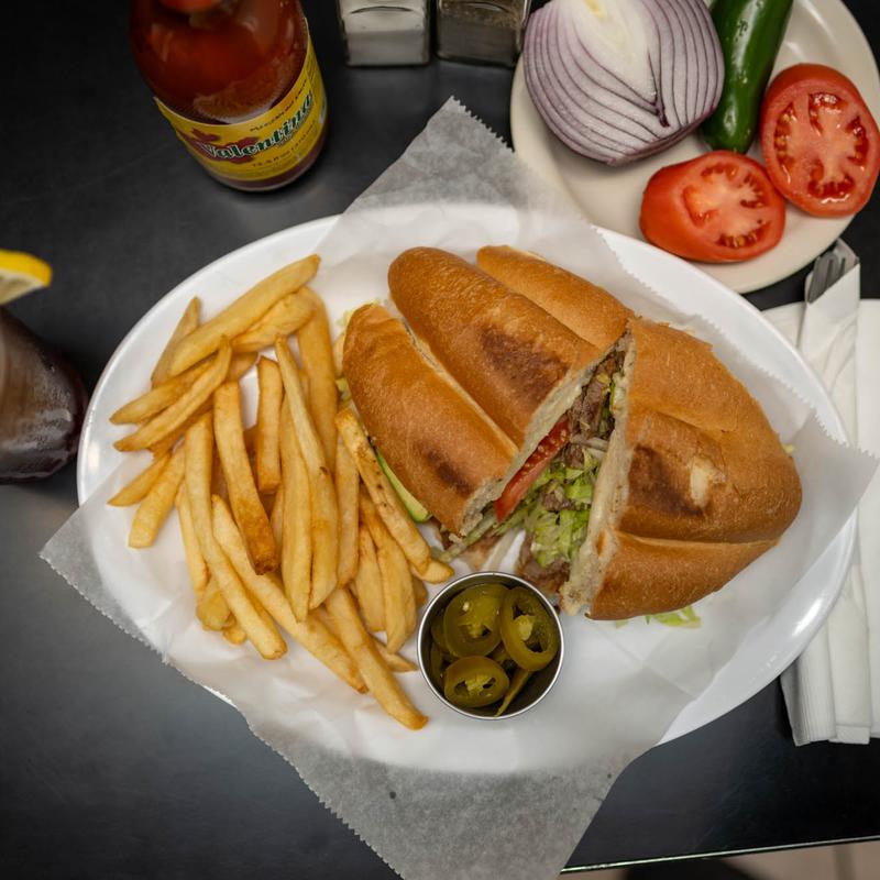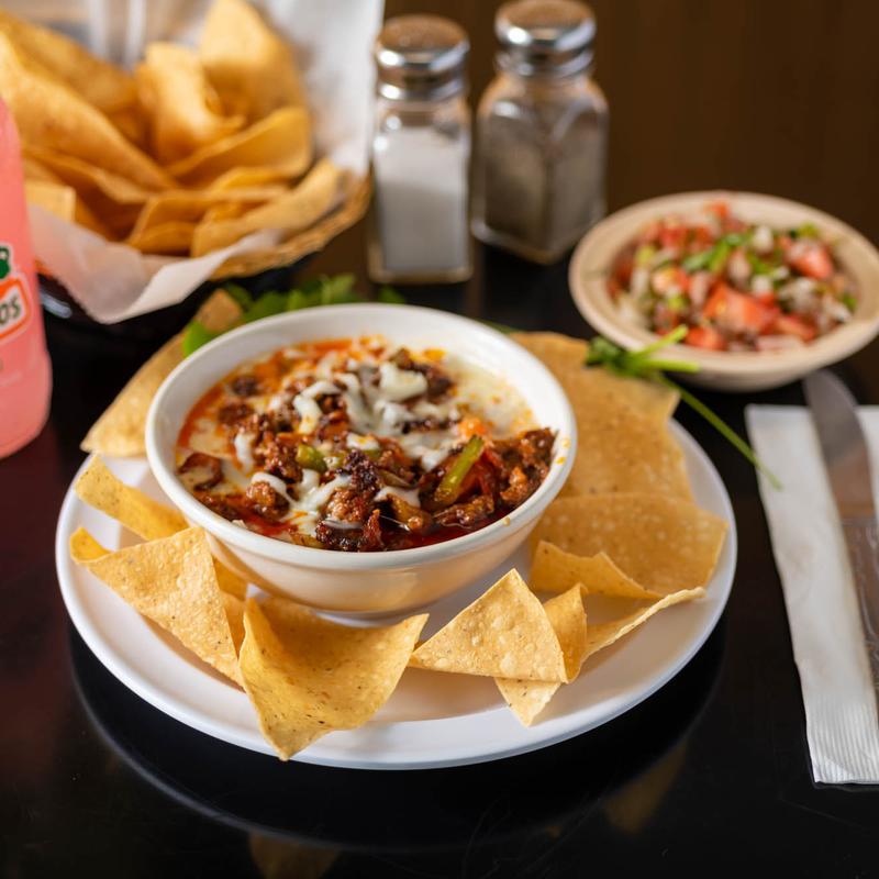Fajita-style beef or chicken grilled and served on a bed of rice or chips, covered with hot melted cheese. Half $8.50 | Full $11.99 | With Shrimp Half $9.99, Full $13.10