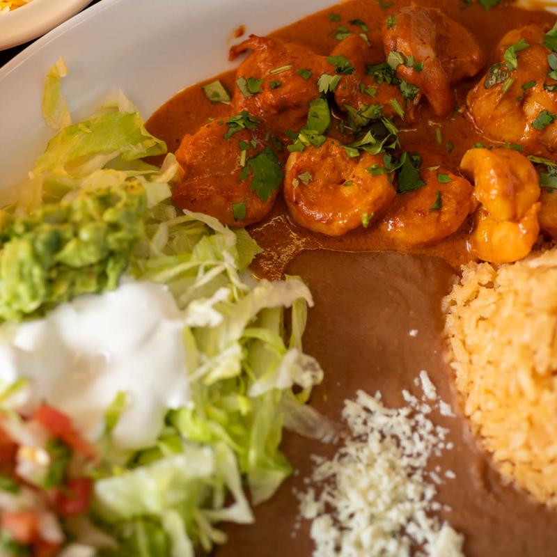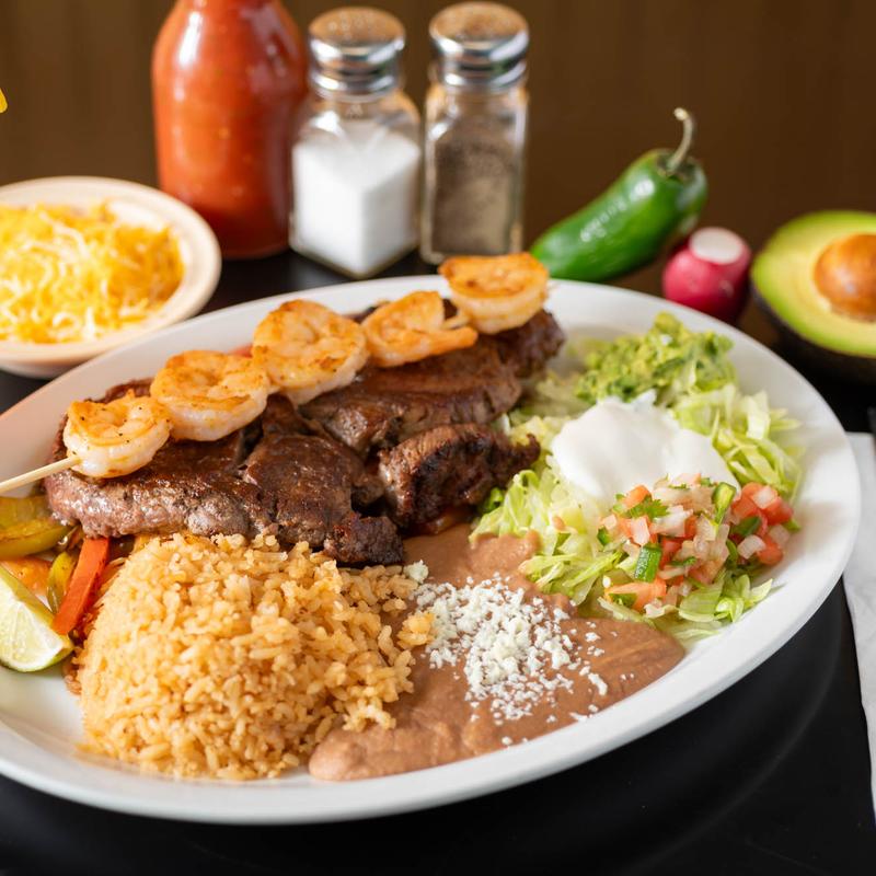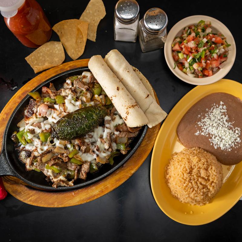 Steak, chicken breast, shrimp, chorizo, bell peppers, onions, and tomatoes cooked in a Mexican stone bowl. Topped with salsa verde, fresh avocado, jalapeño and cheese. Served with rice and beans.