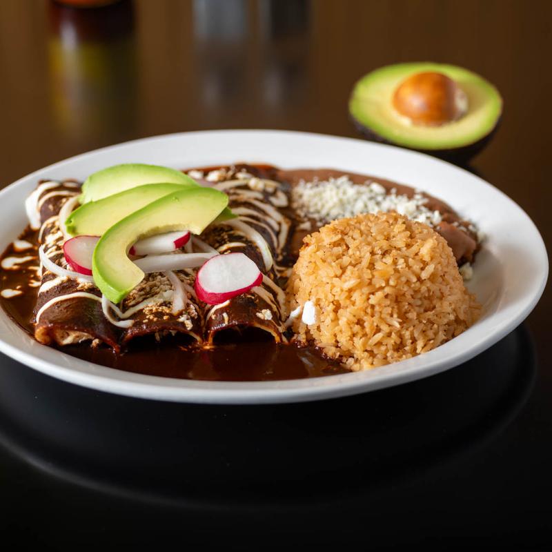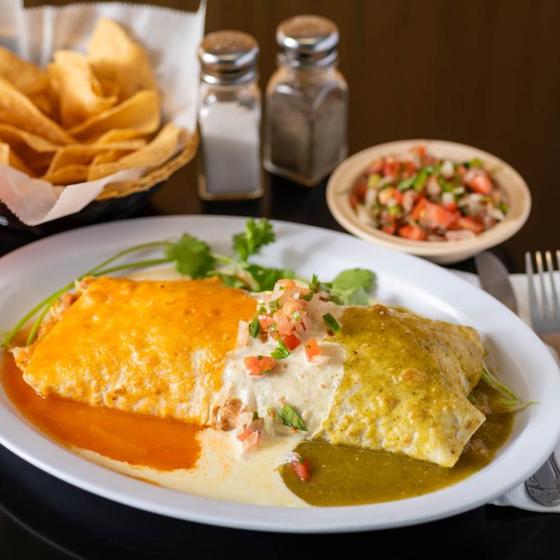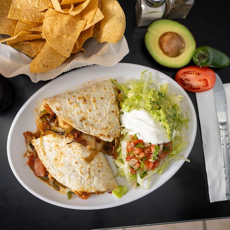A large flour tortilla filled with beef or chicken, covered with hot cheese. Served with rice, beans and guacamole salad. Fajita-style add $1.50