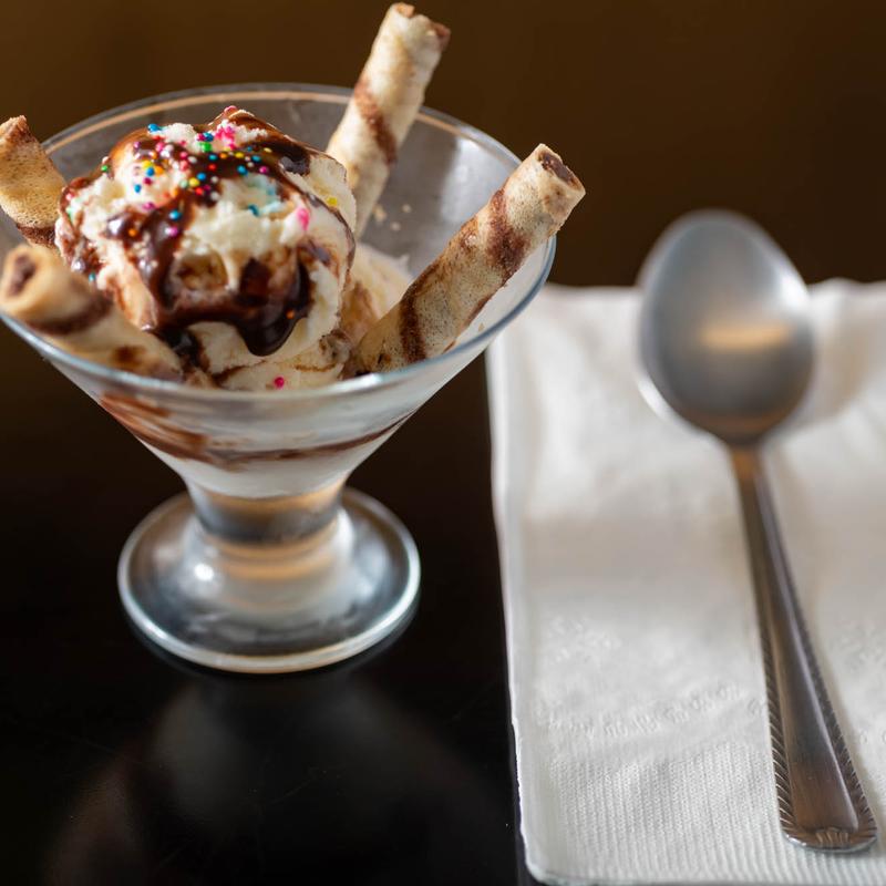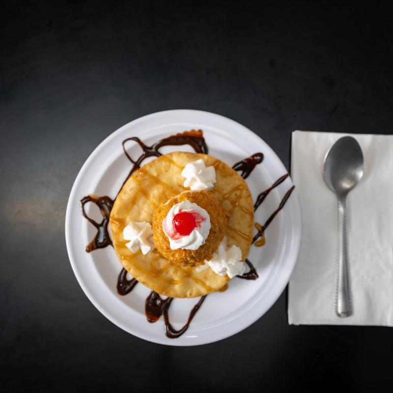 Ice cream rolled in crispy flakes, deep fried and served in a sopapilla, topped with whipped cream and chocolate