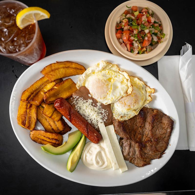 Steak, two eggs, plantains, queso fresco, beans, avocado and salchicha, and cream.