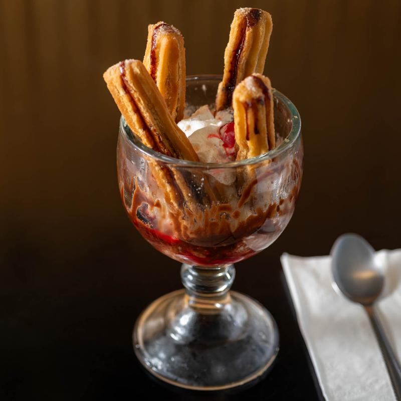 Flour tortilla stuffed with chocolate, deep fried, topped with cinnamon and served with ice cream.