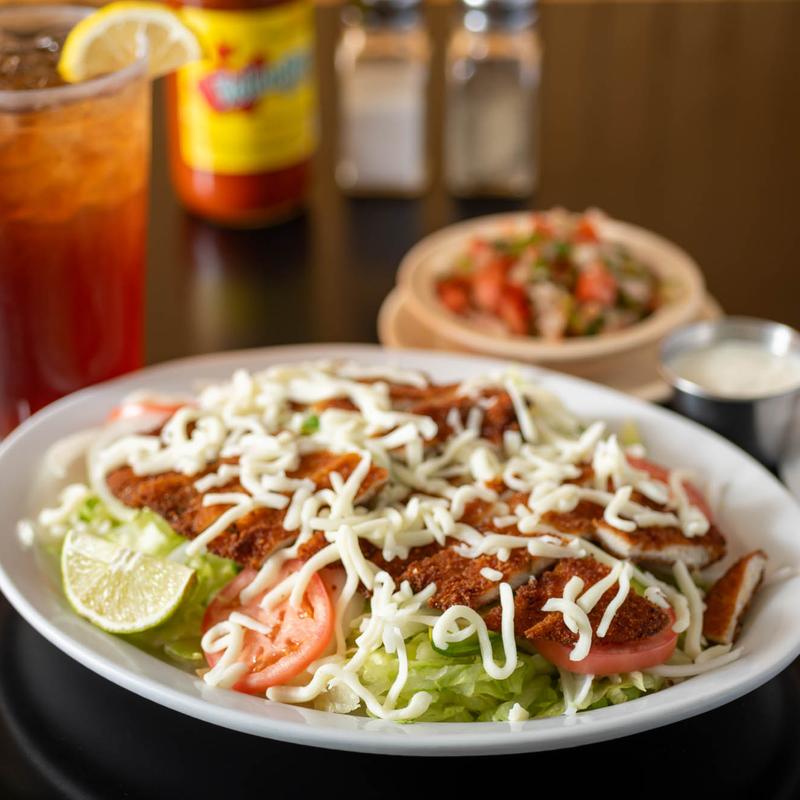 Grilled chicken or steak on a bed of lettuce, tomatoes, onions, avocado slices, and cheese. Shrimp add $2.00