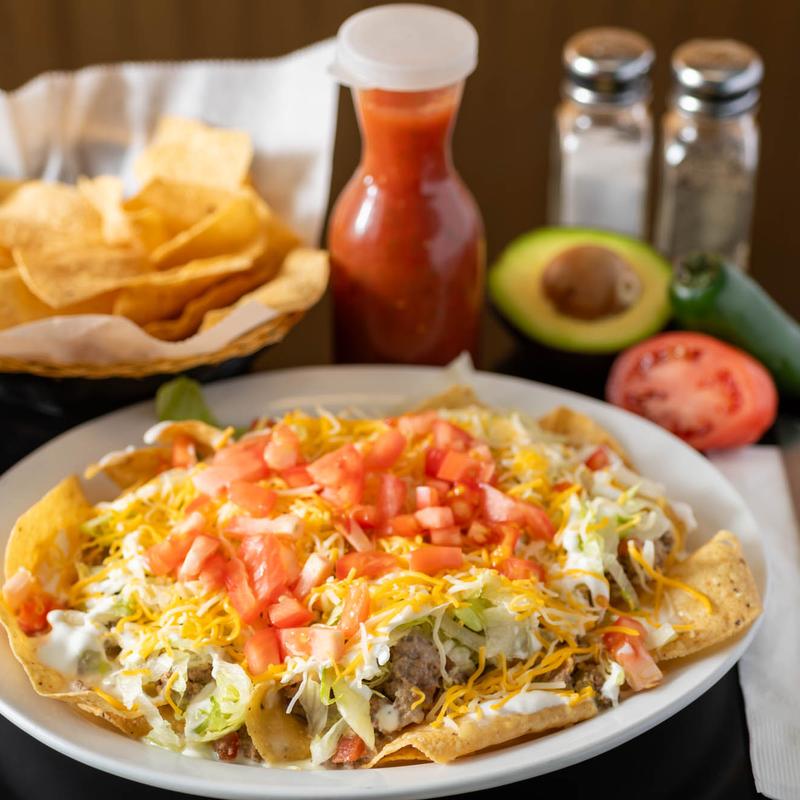 Cheese nachos topped with ground beef or shredded chicken, lettuce, tomatoes and sour cream. Half $9.99 | Full $11.99